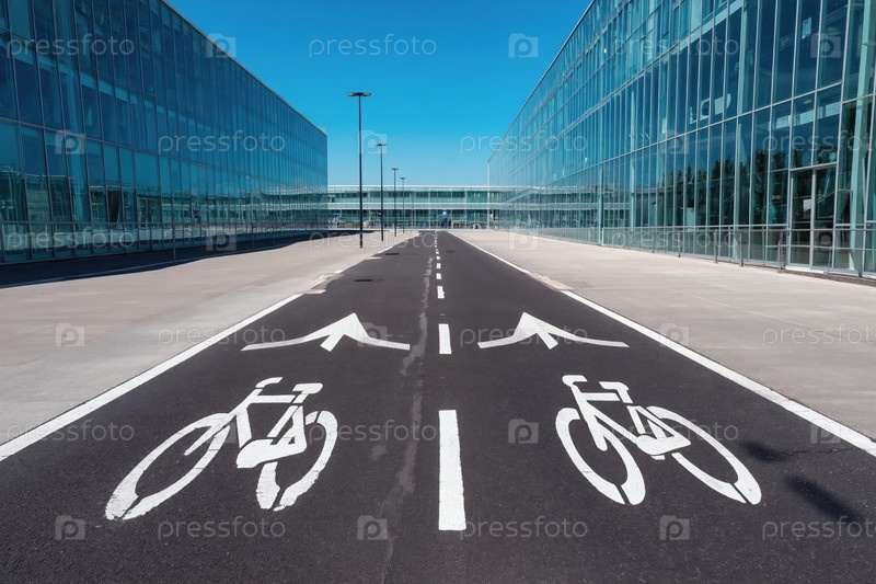 Генеративные пути ИИ для велосипедистов на асфальтовой дороге между городскими зданиями, икона велосипеда