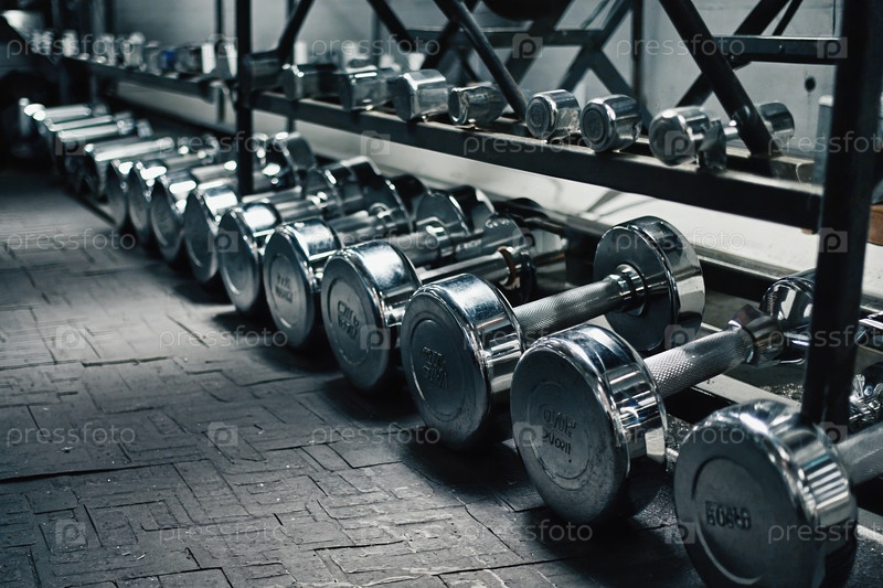 Генеративные гантели ИИ, лежащие на фоне спортзала, оборудование для спортивных тренировок и упражнений