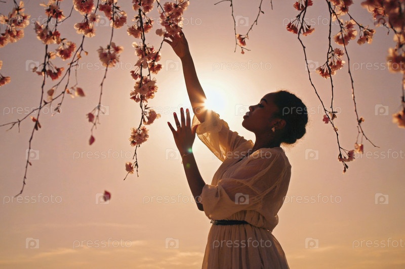 Генеративная женщина, стоящая под ветвями японского вишневого дерева с розовыми цветами сакура