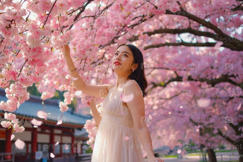 Генеративная женщина, стоящая под ветвями японского вишневого дерева с розовыми цветами сакура