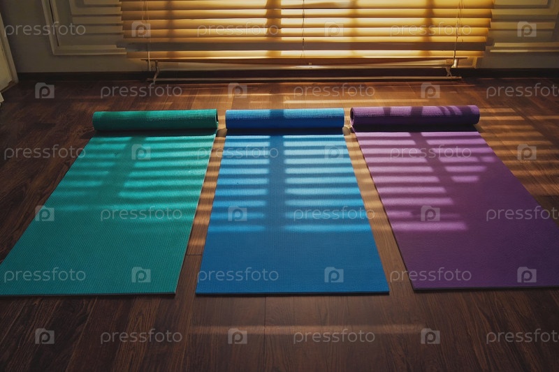 AI Generative Fitness тренажерный зал интерьер, ковры для йоги и спортивное оборудование, лежащий на полу
