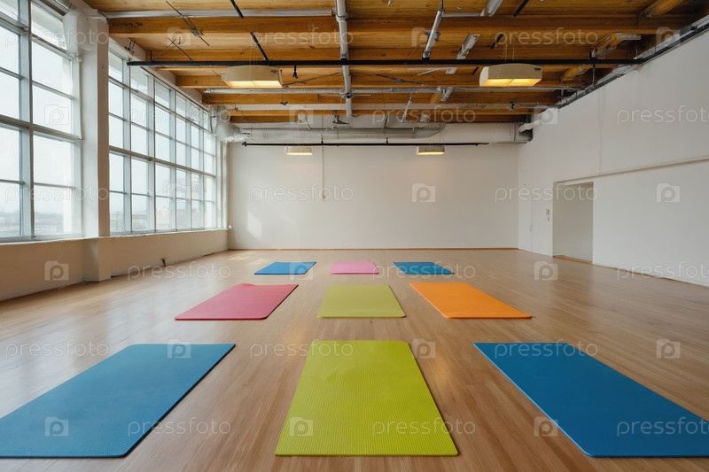 AI Generative Fitness тренажерный зал интерьер, ковры для йоги и спортивное оборудование, лежащий на полу