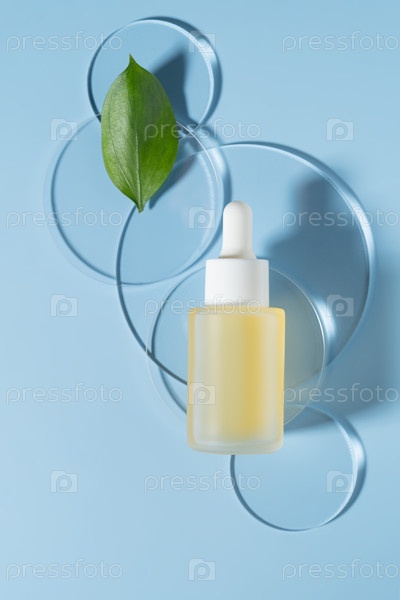 Органический косметический продукт, Сыворотка лица с натуральным ингредиентом и лабораторная посуда на синем фоне, вид сверху