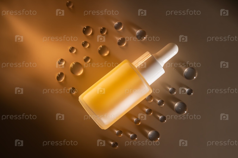 Стеклянная бутылка капельницы с красивым лицом масляная сыворотка на бежевом фоне с тенями и каплями сыворотки. антивозрастная сыворотка с натуральными ингредиентами