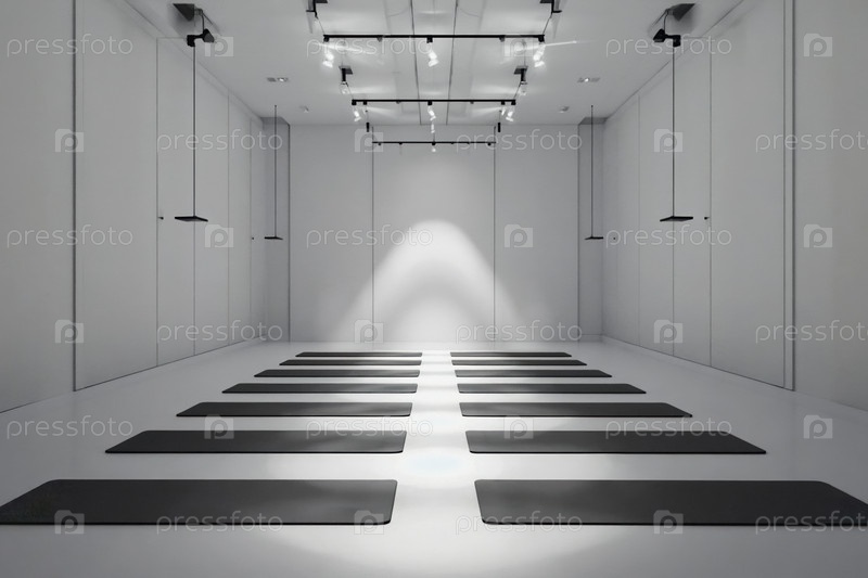 AI Generative Fitness тренажерный зал интерьер, ковры для йоги и спортивное оборудование, лежащий на полу