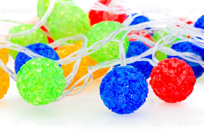 Крупным планом разноцветных шаров электрической гирлянды Рождество на белом фоне изолировано