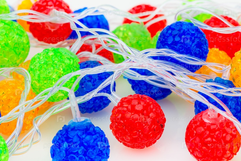 Многоцветные пластиковые шарики объекта на белом фоне - новогодняя электрическая гирлянда
