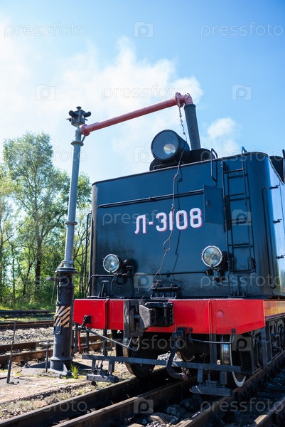 Осташков Тверская область Россия-25.08.2024. РЕТРОПОЕЗД «СЕЛИГЕР» БОЛОГОЕ – ОСТАШКОВ на паровой тяге. Тендер паровоза заправляют водой из гидроколонки через "хобот" и заправочный люк на железнодорожной станции Осташков