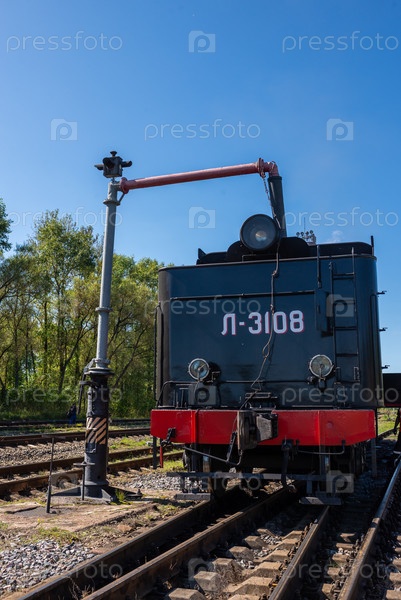 Осташков Тверская область Россия-25.08.2024. РЕТРОПОЕЗД «СЕЛИГЕР» БОЛОГОЕ – ОСТАШКОВ на паровой тяге. Тендер паровоза заправляют водой из гидроколонки через "хобот" и заправочный люк на железнодорожной станции Осташков