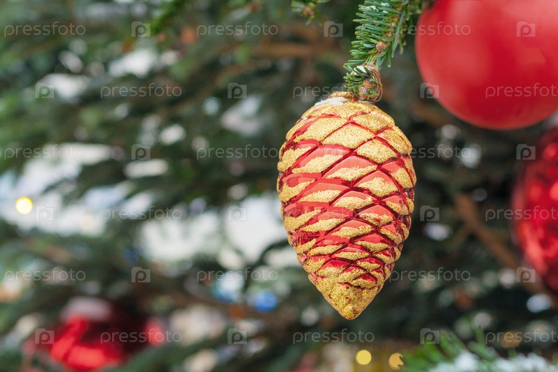 Закрыть вид на игрушку с сосновым конусом на рождественской елке (небольшая глубина резкости)