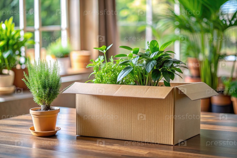 Картонная коробка с растениями на столе. Генерирующий ИИ