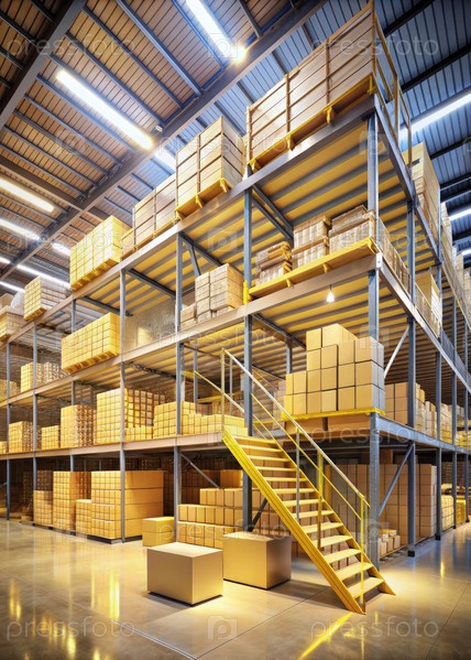Занятый склад, заполненный коробками и лестницами. Генерирующий ИИ