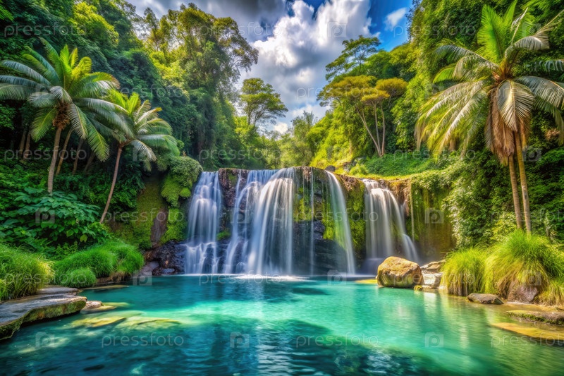 Величественный водопад в пышном зеленом лесу. Генерирующий ИИ