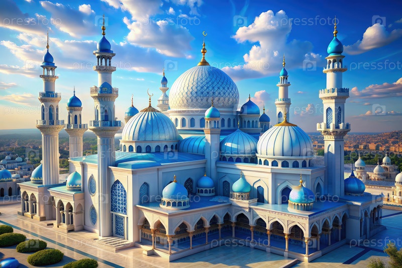 Величественное бело-голубое здание с многочисленными куполами. Генерирующий ИИ