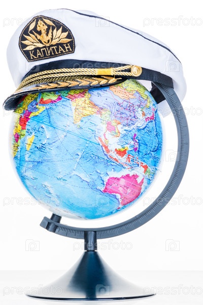 Концепция морского рейса капитан кэп и глобус на белом фоне
