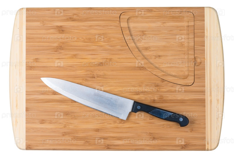 Деревянная разделочная доска и острый нож для повара на белом фоне изолированы