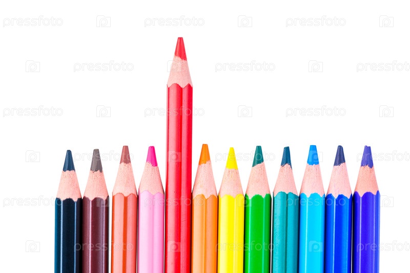 Концепт-фото красного карандаша выделяется из ряда цветных карандашей на белом фоне изолированным