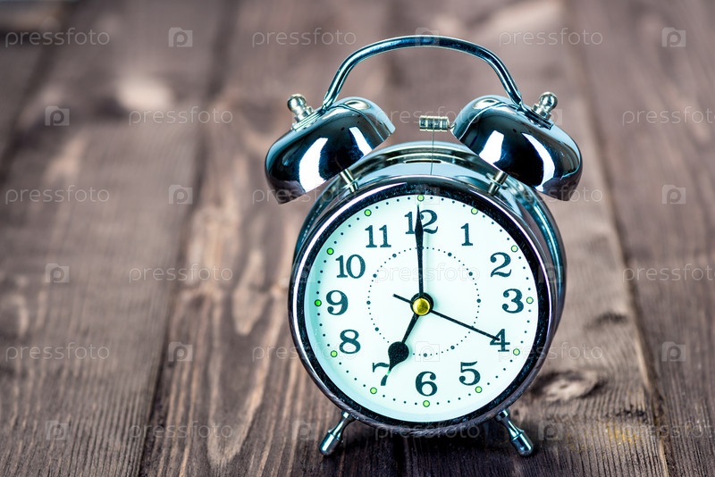Ретро стальной будильник показывает 7 часов на деревянных досках