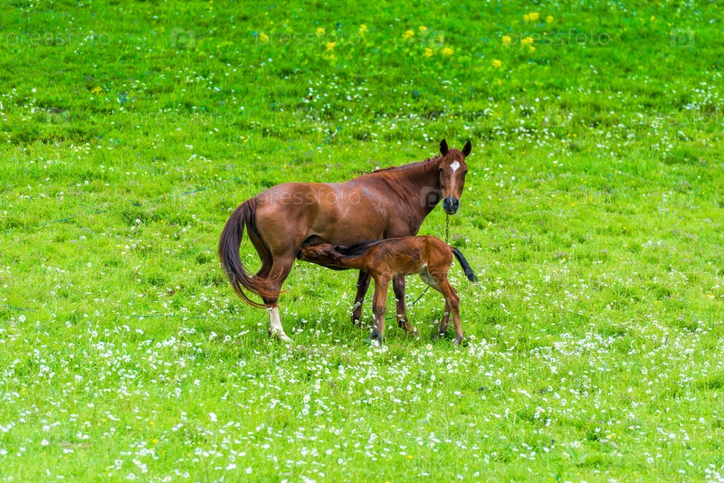Коричневый красивый конь кормит молочного жеребенка на лугу в горах