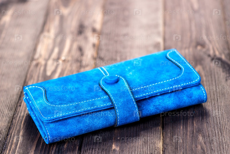 Синий кожаный женский кошелек на темном деревянном полу крупным планом