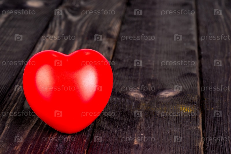 Концепция любви. Мягкий красный антистресс на деревянном темном столе крупным планом