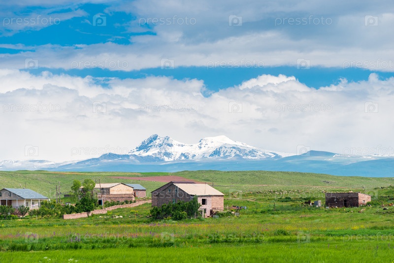 Частные дома в поле на фоне красивых заснеженных гор в Армении