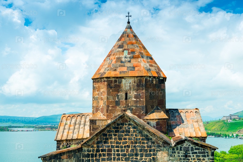 В солнечный день вид на монастырь Армении Севанаванк на озере Севан