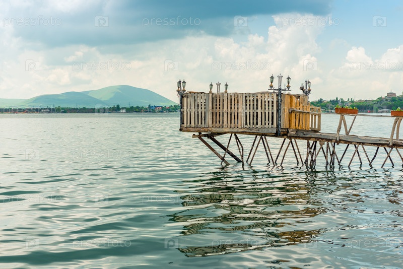 Подлинный деревянный пирс на озере Севан, армянский пейзаж