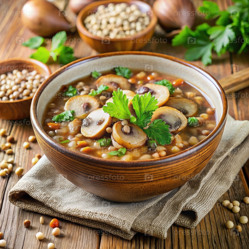 Чаша супа с грибами, бобами и петрушками. Генерирующий ИИ