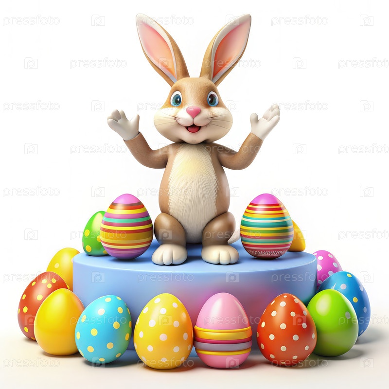 Кролик сидит на столе, окруженный яйцами. Генерирующий ИИ
