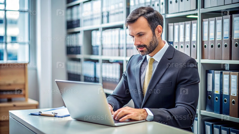 Бизнесмен в костюме, работающий на ноутбуке Генерирующий ИИ