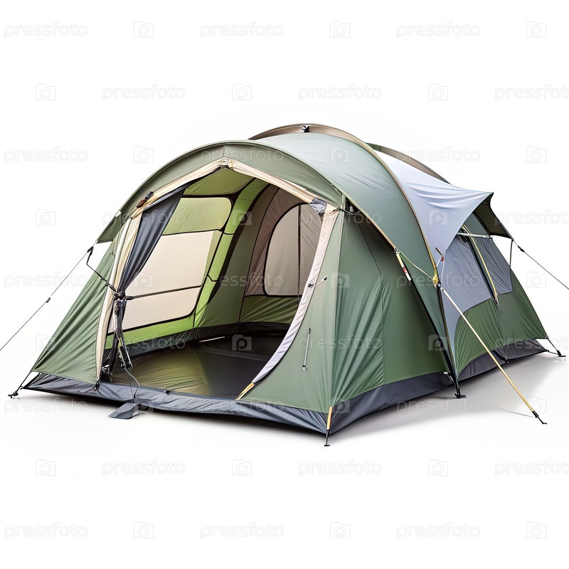 Открытая палатка для кемпинга на белом фоне. Генерирующий ИИ