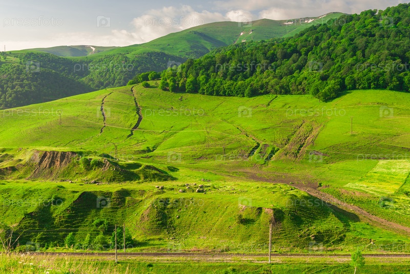 Облегчение зеленых гор и пышная растительность леса в горах Армении в конце весны