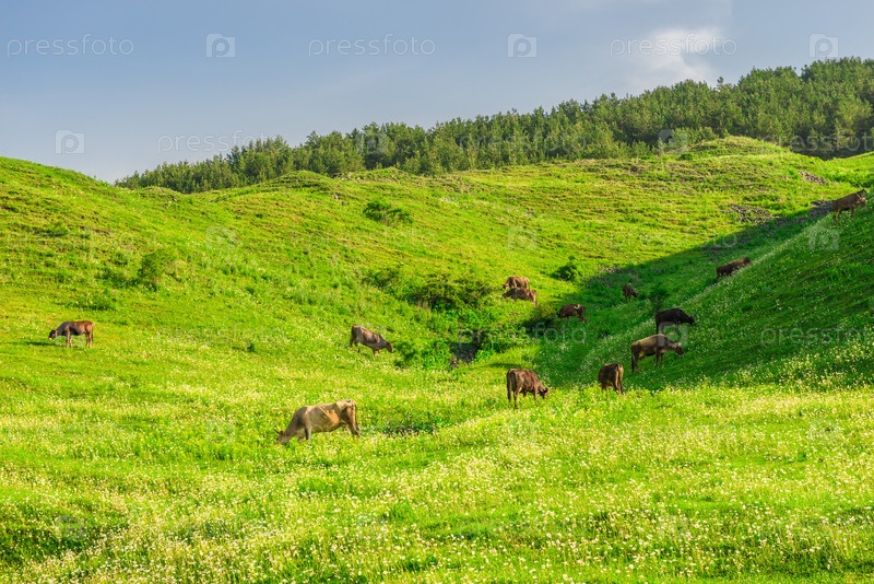 Стадо коров на зеленом пышном лугу, пасущем в горах Армении, Кавказ