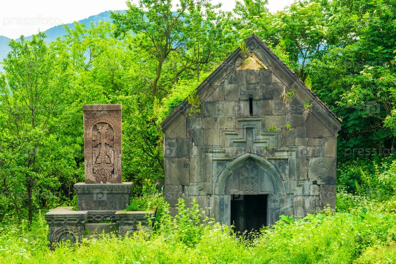 Вид на склеп и каменный хачкар возле монастыря Санаин в Армении