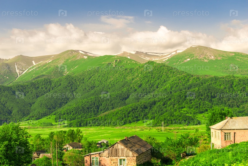 Горные вершины, покрытые снегом и зелеными лугами в солнечный день в Армении