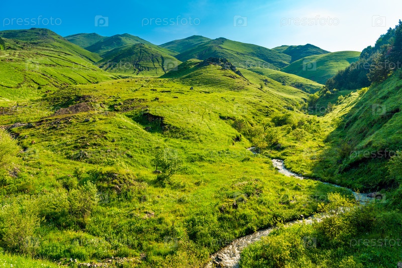 Зеленые ласковые горы и холмы в июне, солнечная Армения