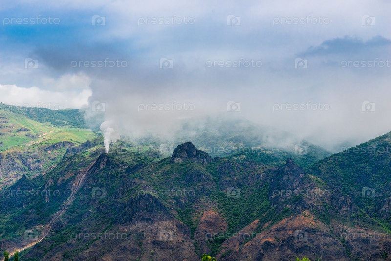 Красивые горы, облака и дым из дымохода растения - понятие экологии