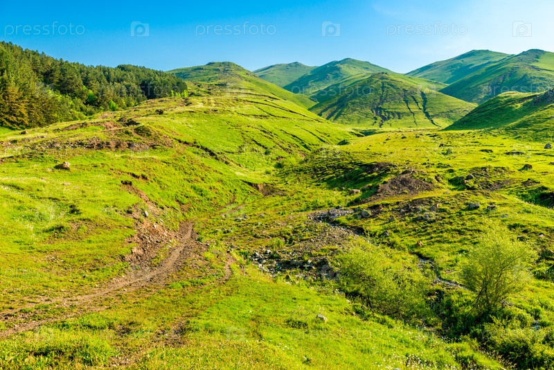 Горы, покрытые пышной травой в горах Армении в солнечный летний день