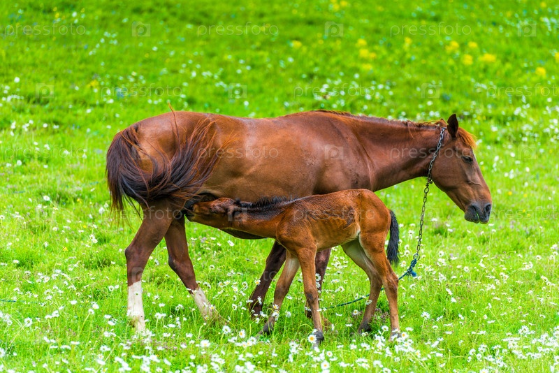 Лошадь кормит маленького жеребенка молоком на зеленом сочном лугу