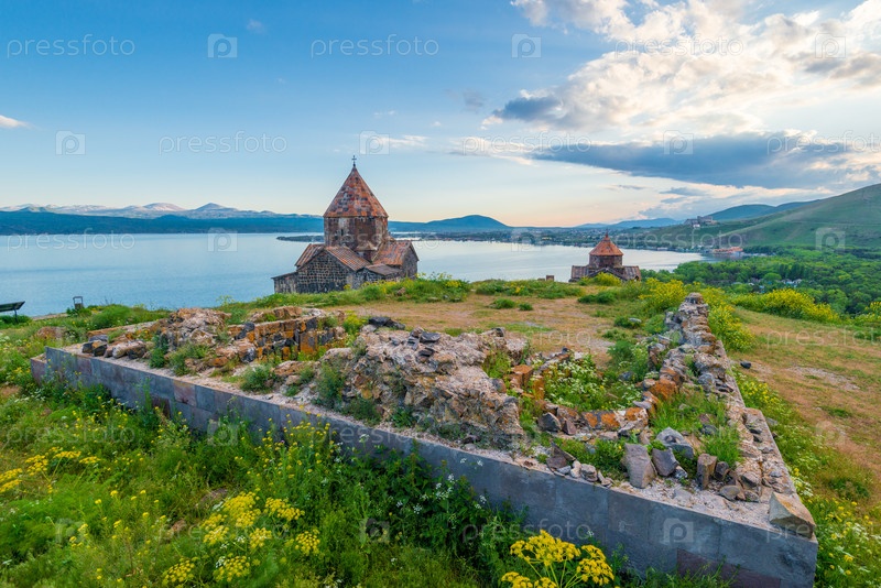 Руины и стены древнего христианского монастыря Севанаванк на озере Севан Армения