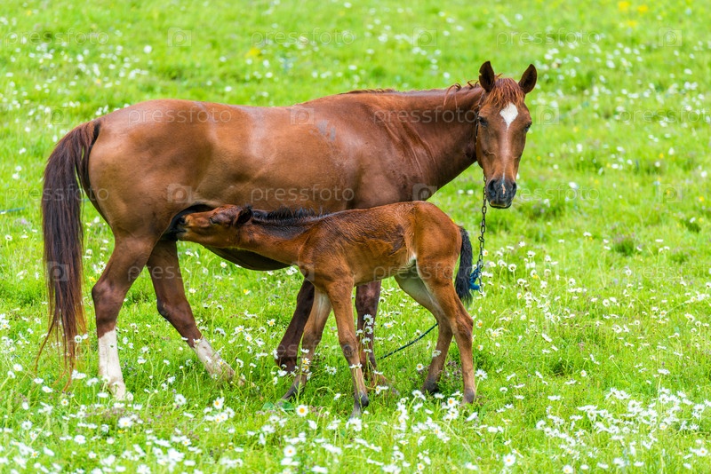 Млекопитающие - лошадь кормит немного жеребенка молоком на зеленом сочном лугу