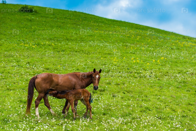 Коричневая лошадь на зеленом сочном лугу с жеребенком