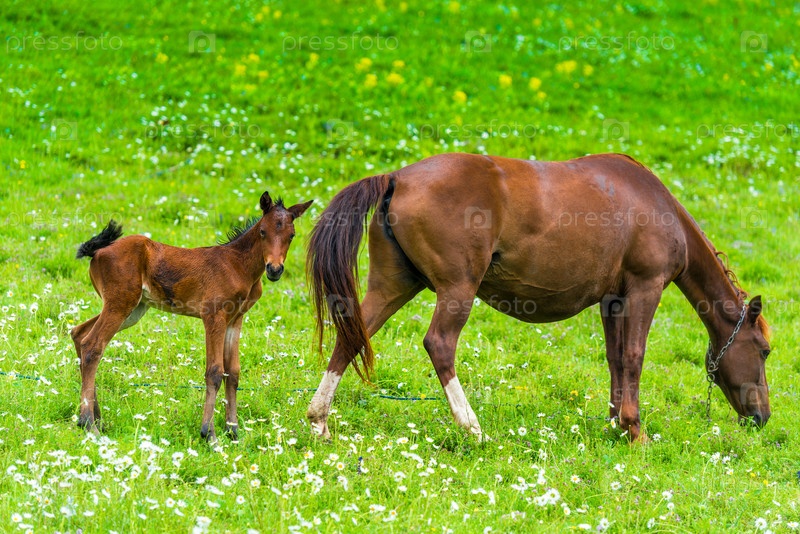 Горизонтальная фотография лошадиной мамы с жеребенком на зеленом лугу