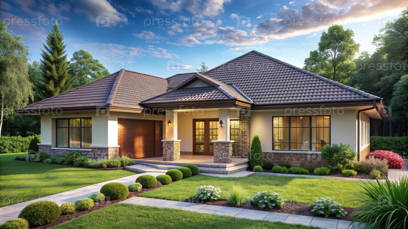 Красивый одноэтажный дом с четырьмя спальнями и передним двором. Генерирующий ИИ