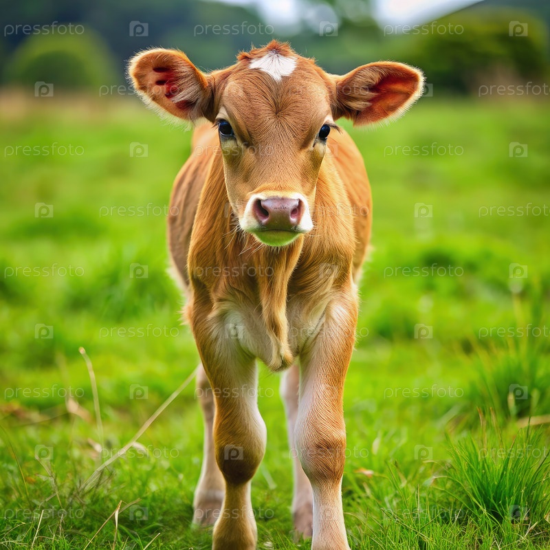 Молодой теленок, идущий по травянистому полю. Генерирующий ИИ