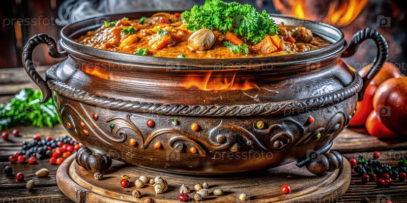 Большой горшок, наполненный едой на деревянном столе. Генерирующий ИИ