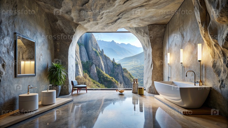 Современная ванная комната с большим окном и ванной. Генерирующий ИИ