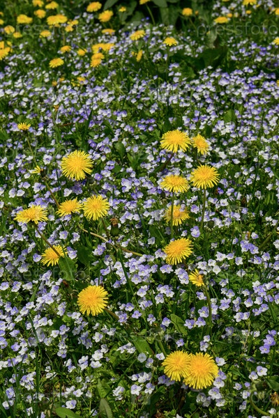 Весеннее поле одуванчиков и голубых цветов анютиных глазок