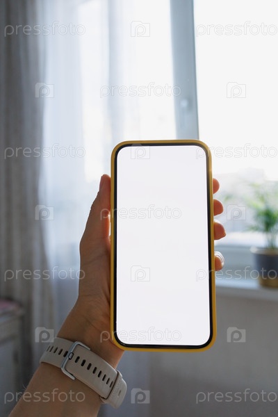 Крупный план человеческой руки, держащей черный белый экран мобильного телефона на внутреннем фоне. макет